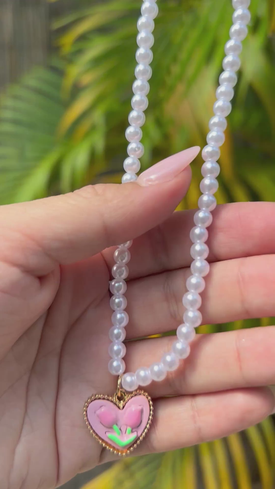 Add a dash of charm with this Heart & Tulips Pearl Necklace, where delicate pearls bloom with the tulips around your neck. The heart-shaped design adds a sweet, playful touch perfect for brightening any outfit with a splash of fun and femininity.